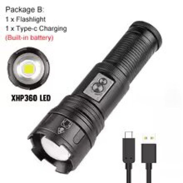 این چراغ قوه برای محیطهای بارانی و مرطوب مناسب است. این چراغ قوه ضد آب با استانداردXHP360 LED+COB/IPX4 و مقاوم در برابر پاشش آب ، حداکثر توان نوری2800 لومن برای مدت زمان 3 ساعت (به صورت مسمتر) ، دارای چراغ هشدار در دسته چراغ قوه با رنگ های مهتابی و آفتابی می باشد و دارای باتری داخلی 26650 همراه کابل شارژر با قابلیت استفاده به عنوان پاور بانک برای شارژ گوشی همراه و دارای پوشش ضد زنگ و ضد خوردگی (ضد ضربه) می باشد.