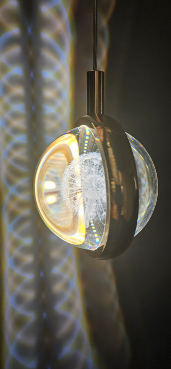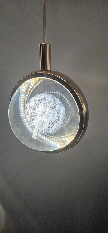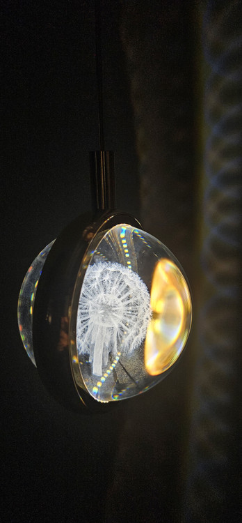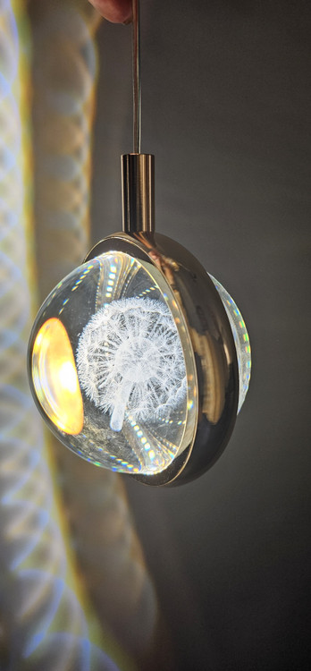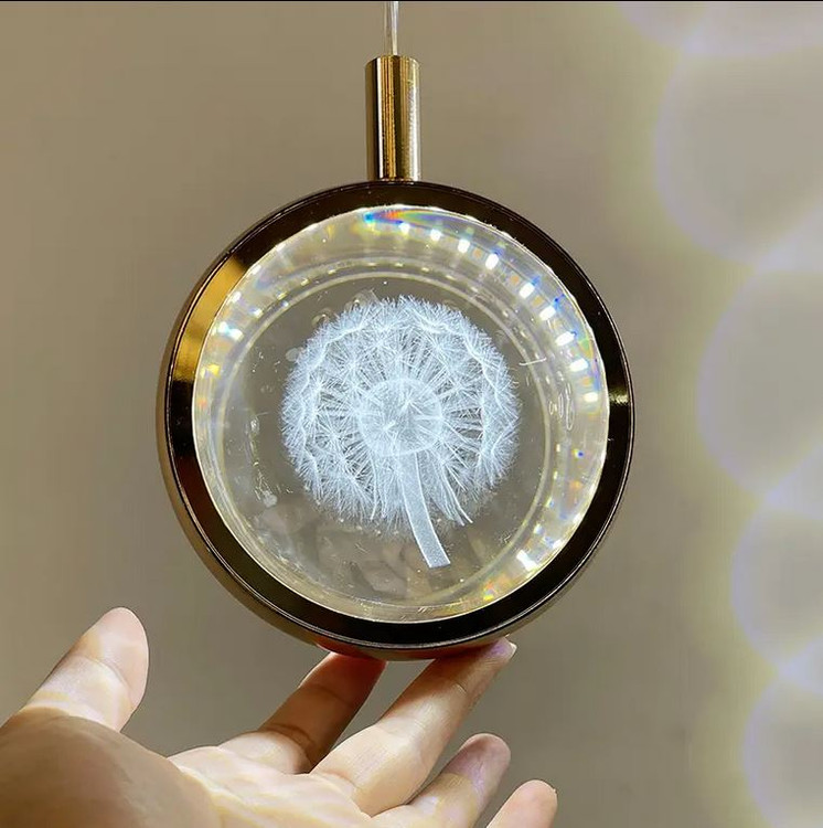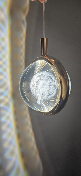 چراغ گوی کریستالی مدل آویزی با بدنه طلایی و توان 7 وات و یک سیم قابل تنظیم جهت روشنایی و زیبایی منزل شما بسیار مناسب هست. از این چراغ میتوان برای کنار تخت خواب یا کنج منزل خود استفاده کنید که علاوه بر روشنایی زیبایی منحصر به فردی هم به منزل شما میده. داخل این گوی یک طراحی سه بعدی با نقش قاصدک انجام شده است. نور این چراغ با هر بار روشن و خاموش کردن چراغ تغییر میکند. روشنایی این چراغ در سه طیف سفید آفتابی و سفید مهتابی و نچرال می باشد.