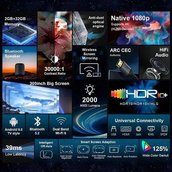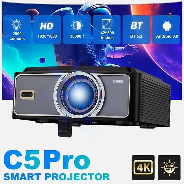 ویدئو پروژکتور مدلC5PRO یک پروژکتور کوچک و قابل حمل که با روشنایی 71500 Ansi میتوانید آن را به راحتی به هر جایی ببرید. این پروژکتور قابلیت پخش نمایش تصویر با کیفیت 4K و قابلیت تنظیم فوکس با دستگاه کنترل را دارد. همچنین این دستگاه قابلیت اتصال به گوشیهای هوشمند اندروید و آیفون را دارد و میتواند محتوا را از این دستگاهها نمایش دهد. این مدل قابلیت اتصال بیسیم به دستگاههای مختلف را دارد که به کاربران این امکان را میدهد تا بدون نیاز به کابل، تصویر را از گوشی یا تبلت خود به پروژکتور C5PRO ارسال کنند. این نوع پروژکتورها دارای درگاههای HDMI، USB و سایر ورودیهای استاندارد برای اتصال به دستگاههای مختلف همچون هارد، کامپیوتر، لپ تاپ و تلویزیون هستند که این قابلیت این پروژکتور را برای استفاده در خانه و ارائههای تجاری یا تماشای فیلم در سفر مناسب کرده است.