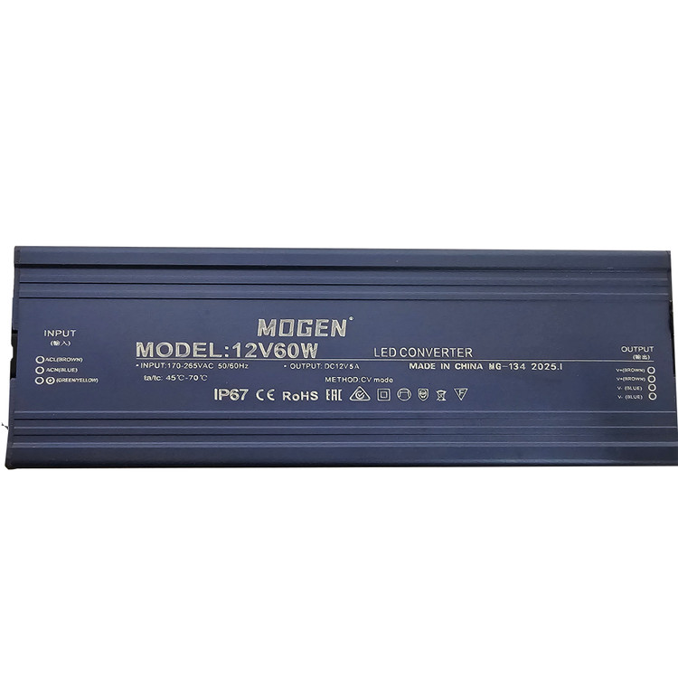 منبع تغذیه موگن مدل 12V60W یک مبدل ولتاژ الکترونیکی است که برق متناوب (AC) ورودی را به برق مستقیم (DC) تبدیل میکند. این دستگاه مخصوص تغذیه تجهیزات 12 ولت DC مانند نوارهای LED، چراغهای تزئینی، دوربینهای مداربسته، یا سیستمهای روشنایی کممصرف طراحی شده است.استاندارد حفاظتی: IP67 (کاملاً ضد آب و گرد و غبار – مناسب برای فضای باز)-دارای تاییدیههای: CE، RoHS، و گواهی کیفیت-قابلیتها و کاربرد:مناسب برای نوارهای LED 12 ولت-قابل استفاده در فضاهای داخلی و بیرونی به دلیل طراحی ضدآب (IP67)-قابل استفاده در نورپردازی ویترین، تابلوهای تبلیغاتی، فضای سبز، آکواریوم، دکوراسیون داخلی، روشنایی مخفی، یا سیستمهای نورپردازی هوشمند.محیطهای قابل استفاده:منازل (نور مخفی یا دکوراتیو)-فروشگاهها-باغها و فضاهای باز-سازههای نورپردازی شهری-تابلوهای LED تبلیغاتی است.